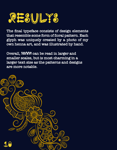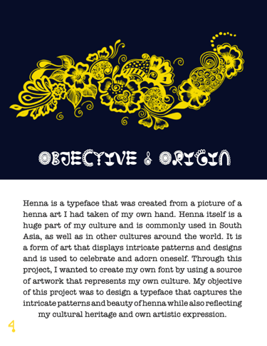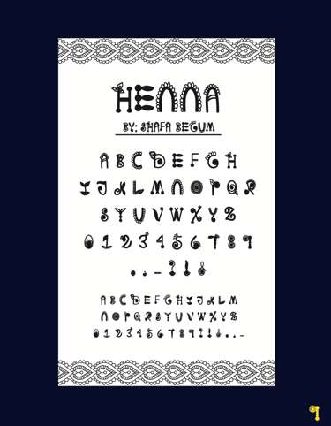 This custom font I created was made using Adobe Illustrator, inspired by traditional henna patterns. Each letter was hand-drawn and carefully crafted using floral motifs, transforming intricate henna designs into a unique, decorative typeface that celebrates my cultural background and personal creativity.