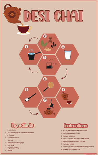 This project is a visual and instructional guide to making traditional desi chai—a beloved South Asian tea known for its bold flavor, aromatic spices, and comforting warmth. Each phase of the chai-making process is represented through stylized illustrations and thoughtful layouts, creating a design that’s both informative and culturally rich. This piece walks viewers through each step of the process, from boiling the tea leaves and spices to the final pour. Beyond just a recipe, it’s a celebration of heritage, hospitality, and the everyday ritual that brings people together over a cup of chai.